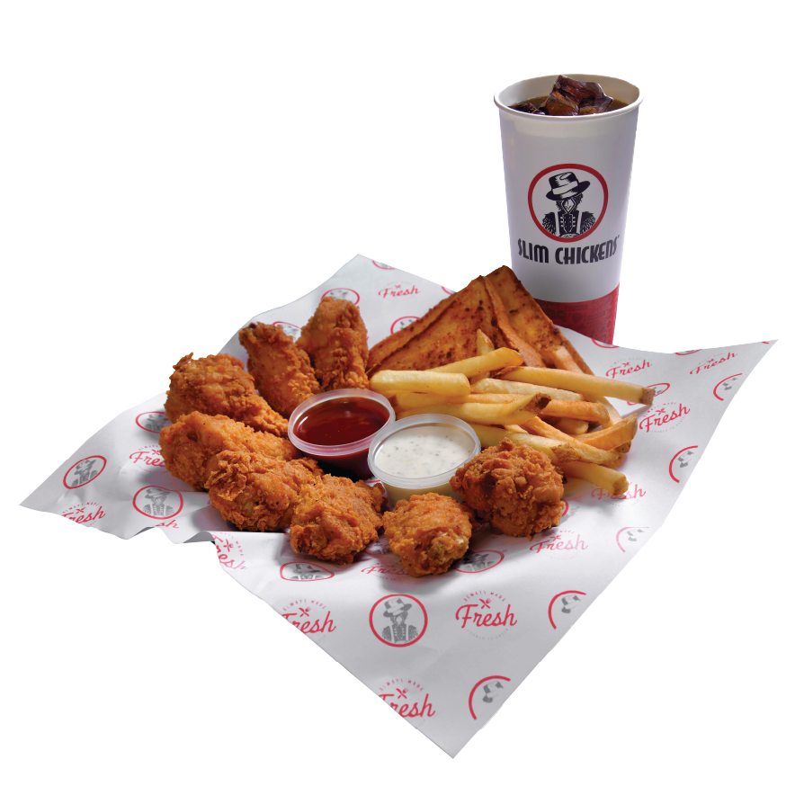 EIGHT 100% all-natural chicken wings, perfectly fried and shaken in any one of our house sauces. Served with classic Texas Toast, two house sauces, large fries and a large drink. From original to spicy and everything in between, your wing game is strong with Slim Chickens.