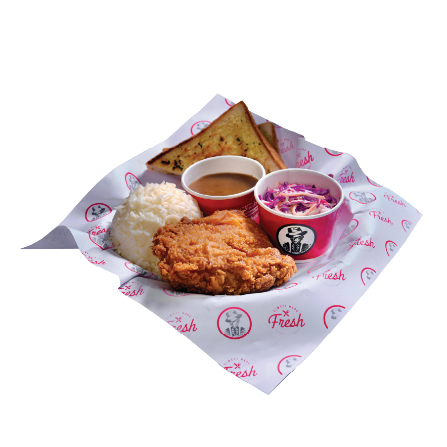 Boneless whole chicken chop, fried to perfection and served with rich 💯 marinated with buttermilk and slim breading, hot chicken gravy. Comes with a side of creamy coleslaw, slim’s flavoured rice, and two pieces of warm Texas toast.